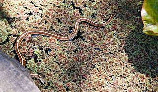 This little guy turned up in our garden pond today, floating on the salvinia. He was very relaxed, letting me get a foot away with the camera. According to Wikipedia, garter snakes are …” the single most widely distributed genus of reptile in North America.” This looks a lot like the San Francisco garter snake, an endangered species.