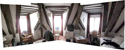 We took the high speed train from Frankfurt to Paris yesterday. A bit weird: you see a nice village, and pffft! it’s gone, at 100 mph. And so into Paris, where we’re now ensconced in what has to be my favorite hotel room of all time, a half-timbered 6th-story, top floor garret in the oldest part of Paris, next to the Sorbonne, walking distance to Notre Dame, the Latin quarter, and all manner of cafes and shops. Right now I’m sitting in a sunny dormer in our attic room, looking out at Paris rooftops, dictating this with a with my Sennheiser ME-3 head microphone.