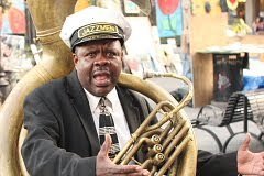 “I get back to New Orleans, they had agencies was giving away instruments to all the musicians. Everybody getting brand new horns, but me and a brand new horn, oh no. A new horn you gotta nurse it like a baby. The horn gotta grow up with you. I ain’t got time for that shit. I said let me get this here tuba, some forty years old, donated from Wichita, Kansas. Everybody saying, Tuba what’s wrong with you getting that old horn? Let me tell you something, ain’t nothing like a horn that’s ass done been whipped and beat up on. That way before the horn can beat me up, I’m beating up on the horn. It’s gotta have the seasoning, the flavor. Just like frying chicken. You can’t fry no chicken unless that skillet been seasoned. See, with chicken they got something called Tuba’s chicken, you know my momma and daddy done taught me. And that’s the best damn chicken. Now, I could tell you how to make Tuba’s chicken, but you go home and your chicken ain’t gonna taste the same. Why? Cause you ain’t go the same pot. Your pot ain’t been seasoned. See, me and my music done been seasoned. I gotta have me a horn that got the same flavor…”