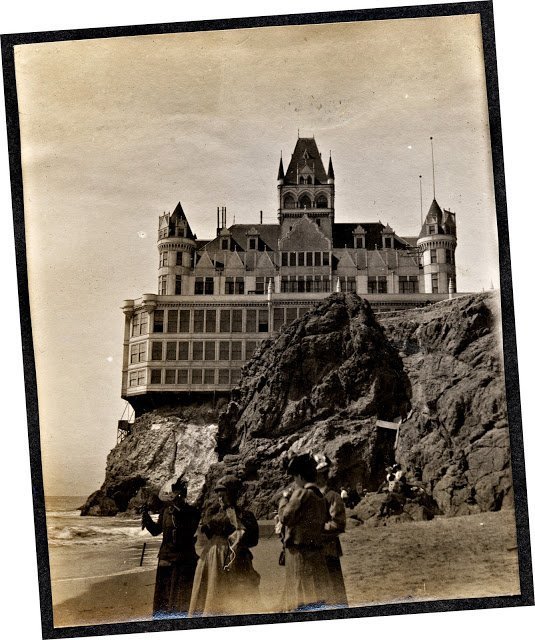 The first Cliff House was built at Ocean Beach in San Francisco in 1863. On Christmas day, 1894, it burned to the ground. Mayor Adolph Sutro had it redesigned by architects (as a “…large and pretty chateau”) and it was rebuilt in 1895 in its above reincarnation. This building lasted until 1907, when it burned to the ground. In 1909 a 3rd, much plainer version was built. This was remodeled several times, the latest in 2003, and the present version is disappointingly soulless and has none of the character or charm of its predecessors.