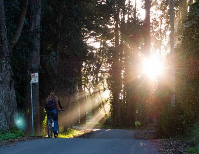 Danny cycling up the road Friday night. Danny has beautiful curly auburn red hair, and when she got into the light, it glowed.