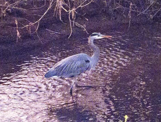 On my way to the beach around 5:30 PM yesterday, I spotted a blue heron in the creek, Funny, because these are the spookiest birds in the area, and this one wasn’t bothered by my proximity. I kept inching forward, shooting pics, until I was about 25 ft. away. He stayed there, aware of my presence for sure, but not concerned. Finally I walked past his part of the creek and went around a bend. I heard this fluttering, and he had flown over my head and descended into the creek right in front of me. It was a thrill, this elegant creature swooping so close. (Look at those delicate white plume feathers, nature’s decoration.)