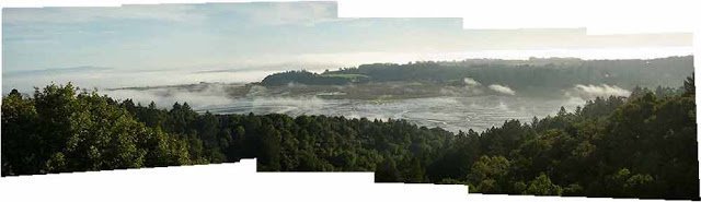 Panorama of lagoon with wisps of fog shot on a bike ride Friday.