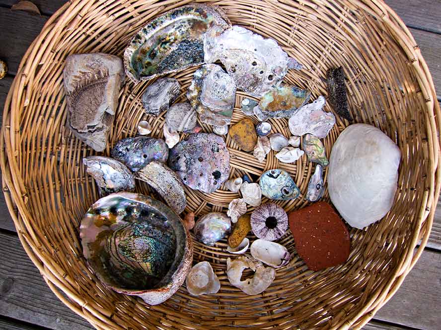 Note polished pieces of abalone, and at 10 o’clock (left side), cross section of fossilized bone.