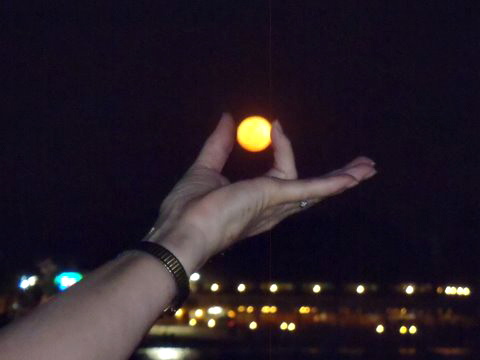 From Bill Castle of Pollywog Holler: “Barb proved that the “Big Moon” Sat night was not really big but it did get close enough to the Earth, for her to grab it…”