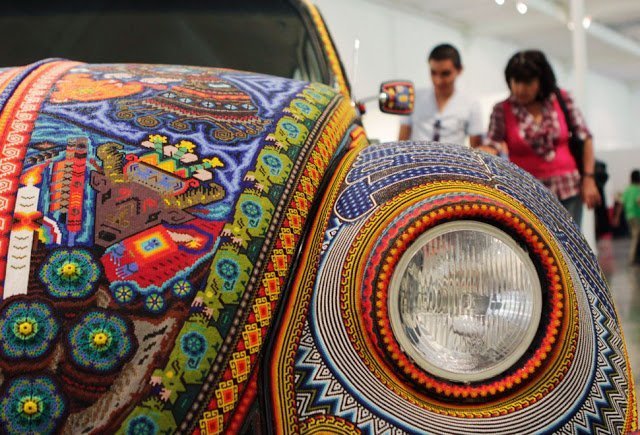 “People look at a 1990s Volkswagen Beetle named “Vochol” during an exhibition on Huichol culture at the Museum of Puebla, near Mexico City August 10, 2011. The name “Vochol”, was conceived from a combination of “Vocho,” a popular term for Volkswagen Beetles in Mexico, and “Huichol”, a Mexican indigenous group. The car was decorated by indigenous craftmen from the Huichol community living in the states of Nayarit and Jalisco, using traditional beads and fabric. According to local media, the work will be auctioned after its exhibition in Paris and Berlin next year, with funds and proceeds going to the Huichols.”