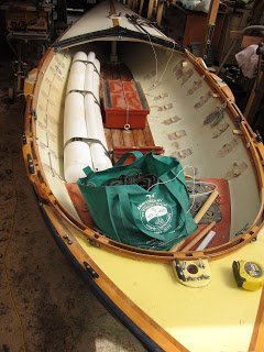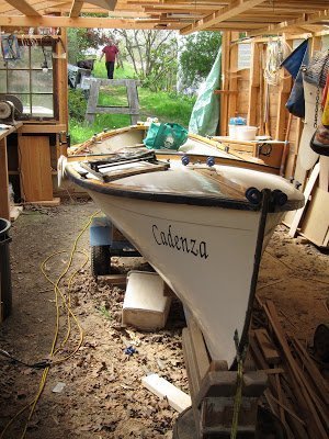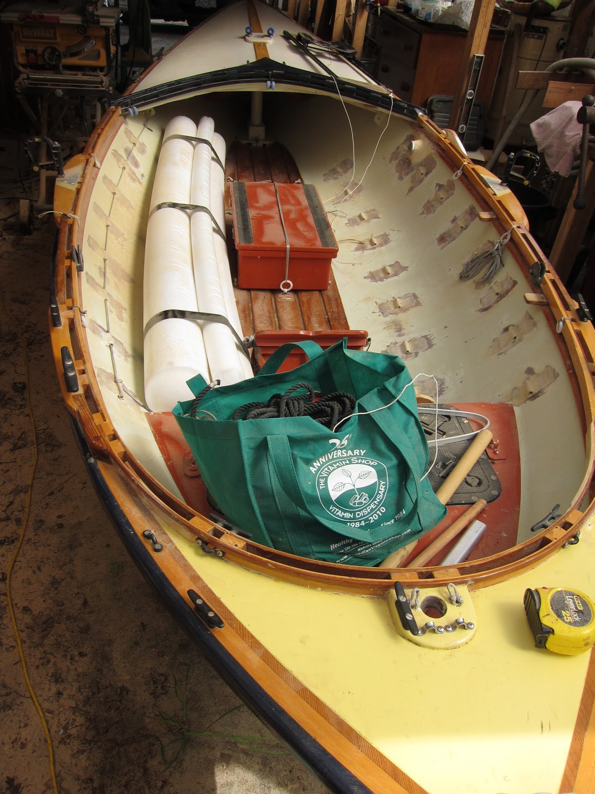 Paul Clark’s homebuilt 16′ row/sail boat in Victoria. The hull without any equipment weighs about 150 pounds. Paul has a leeboard on the starboard side. (With a centerboard he wouldn’t be able to sleep in the boat — which he does). He’s rowed and sailed in local (Vancouver Island) waters and has gone on trips of a week or more. He and Godfrey are talking about sailing across the Strait of San Juan de Fuca in September, Godfrey in his 12′ San Francisco Pelican, to go to the Port Townsend Wooden Boat Festival (Sept 7-9.)
