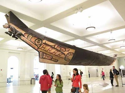 There is an entire large room full of totems, shields, baskets, clothing, jewelry, and a myriad of items made from cedar trees. It’s a stunning exhibit (and once again I apologize for being “stunned and amazed,” as my friend Jack Fulton says, but I just am, often).The star of the show is this enormous canoe. I couldn’t find any measurements, but I’d guess it to be 60′ long and at least 12′ wide — all made from a hollowed-out single tree. It’s thought to have been a Heiltsuk raiding canoe (see the Edward Curtis film, “Land of the War Canoes,” I posted earlier). Here are some other photos of this powerful art. (See Builders of the Pacific Coast, pp. 110-12, for the building, art and construction techniques of the First Nations peoples.)