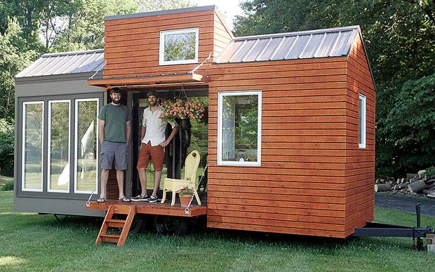 “Brothers Adam and Aaron Leu stand on the porch of their “tiny house,” which has been bought by a Kentucky couple and will be transported there. The house, approximately 130 square feet, includes a kitchen, bathroom living room and loft. It took the brothers about 3 1/2 months to build.”