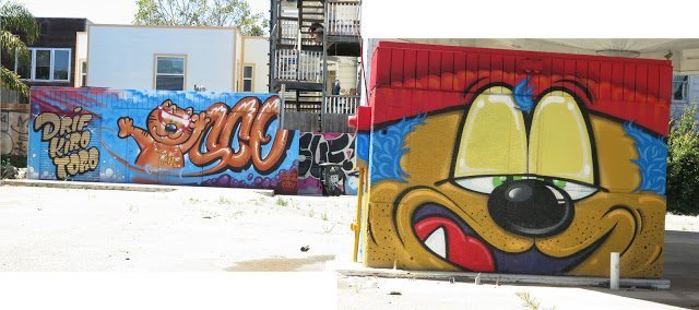 This was in a vacant parking lot on Valencia Street in San Francisco on Wednesday. It was surrounded by a cyclone fence, so I had to shoot it through the holes in the fence. It’s a bit difficult to get the perspective with so little of the background. The painting on the left is on a wall that’s about 50 feet behind the little building on the right with the close-up.
