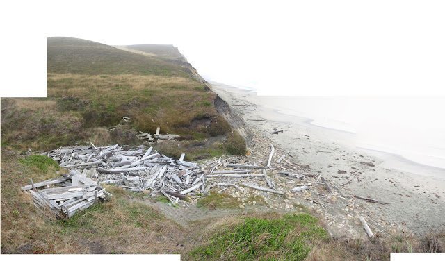 Many years ago i spent a couple of weeks in the town of Mendocino and camped on the beach which was just below the town. The sand was strewn with driftwood of all sizes. Together with some other wayfaring sorts I helped to build lean-to shelters there, and we camped there during that time. I have a vague memory of waking up and finding my shoes had been washed away but other than that a grand time was had by all; playing music, building fires and other recreational activities. We got miner's lettuce from the cliffsides there – the bright orange flowers were edible and we cooked them up in a stew.
