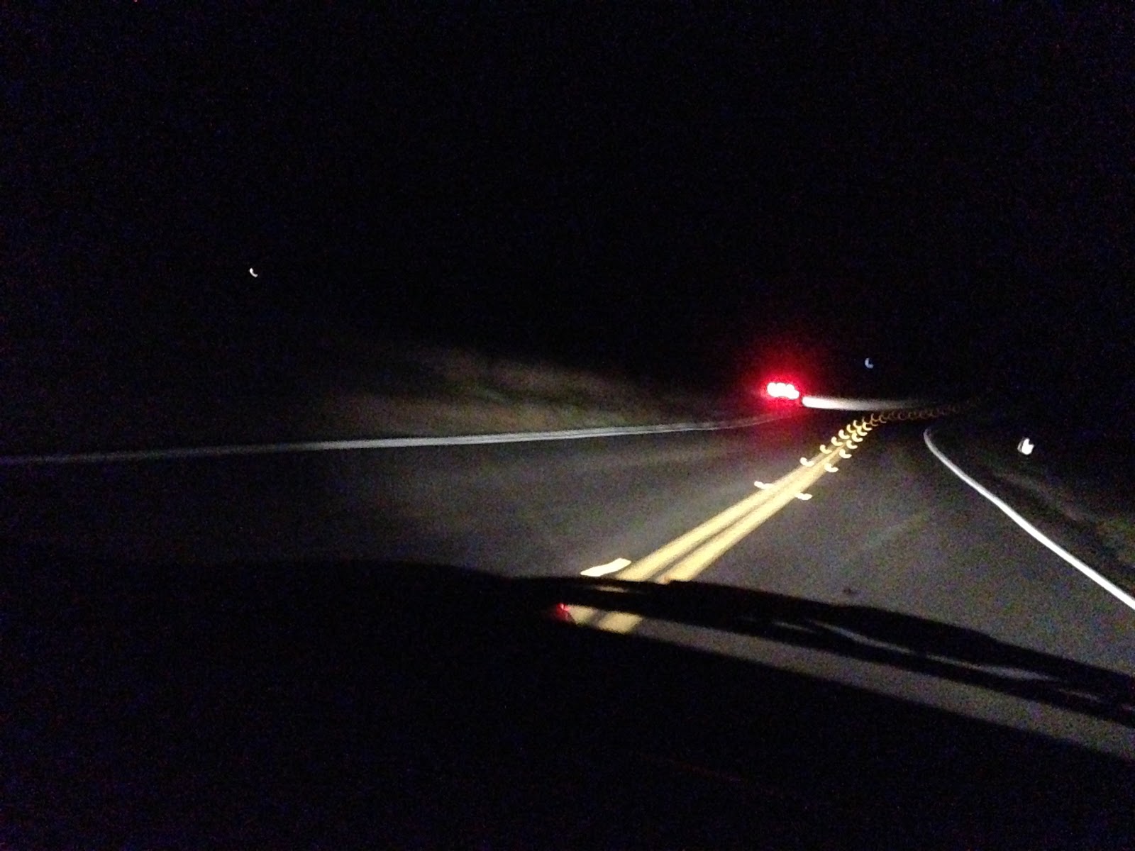 This is a photo shot with my iPhone on the way home, driving along the coast, the red lights being an approaching car. I discovered that if I touched my brakes, I saw the road reflectors light up red in my rear view mirror. So I’d touch the brake pedal every once in a while, see the string of red lights in the mirror, then focus back on the road in front. It was like a light show, with this music on Sirius Radio: Meet Me in the Morning by Bob Dylan, Rambling Man by Waylon, then Bring Back Joe by Scotty McCreery. Fahhr out!