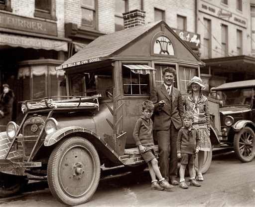 “…These are the wandering writers June and Farrar Burn and their sons North and South in their homemade camper in 1928.”