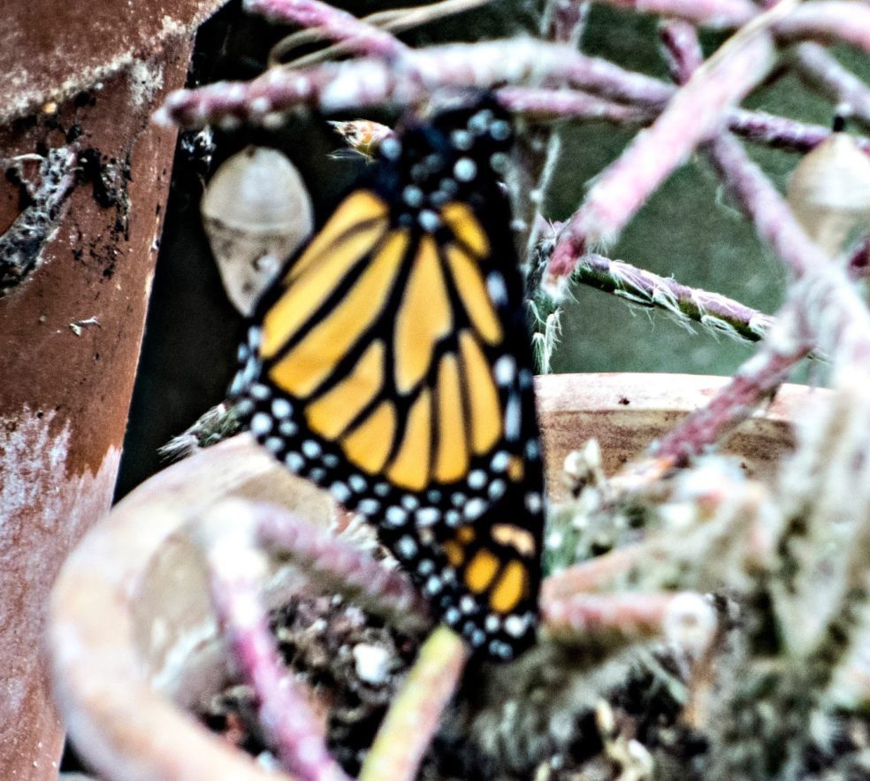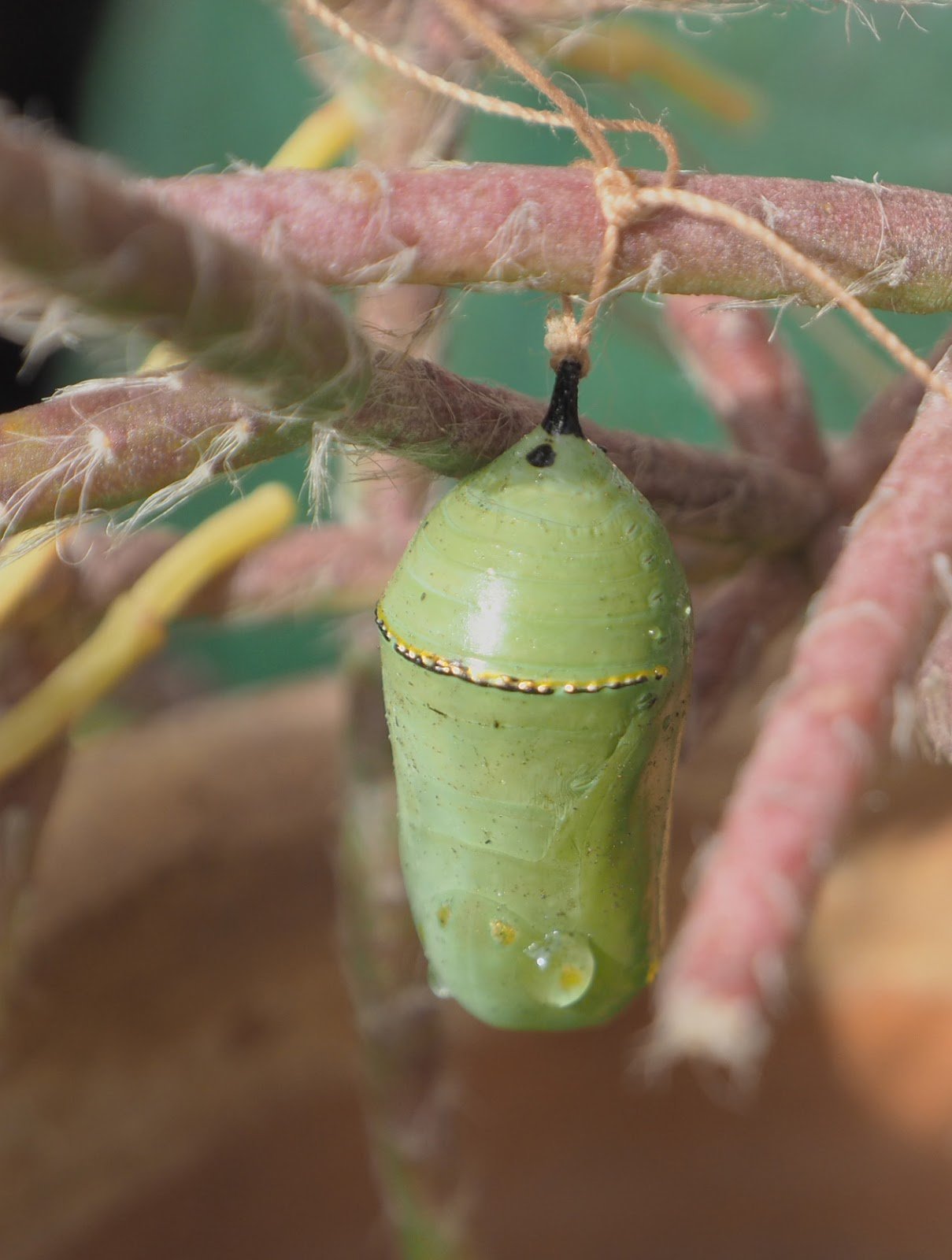 Swarms of monarchs used to pass through town on their southerly migration, but in recent years there have been hardly any. This chrysalis appeared in our garden a few weeks ago and when it got knocked off the plant, Lesley tied it back and put the pot in the greenhouse. (Note the gold dots.)