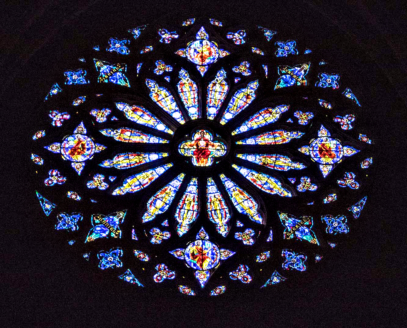 The high stained glass windows are really too high to see, and I much prefer geometric shapes (like these) to biblical scenes in stained glass.