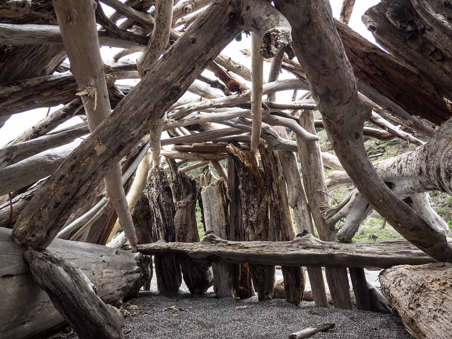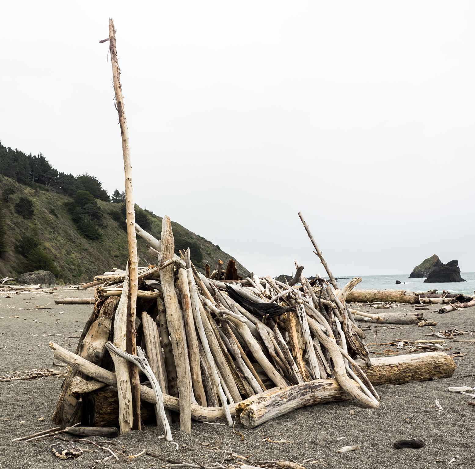 After breakfast in Boonville, Louie and I drove through the giant redwoods back to the coast and went out to Navarro beach, a driftwood mecca. Here’s the inside and outside of one of the shacks.