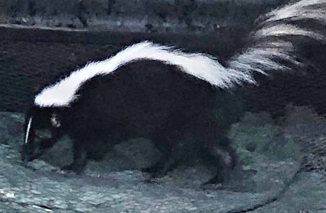 First skunk I’ve ever seen in garden in daylight. I’ve trapped a bunch of them over the years—tricky procedure—only when they impinge rudely. Was going to trap this guy because he’s been hassling chickens, but am now wondering if I can befriend him. We”ll see. Beautiful little critter.