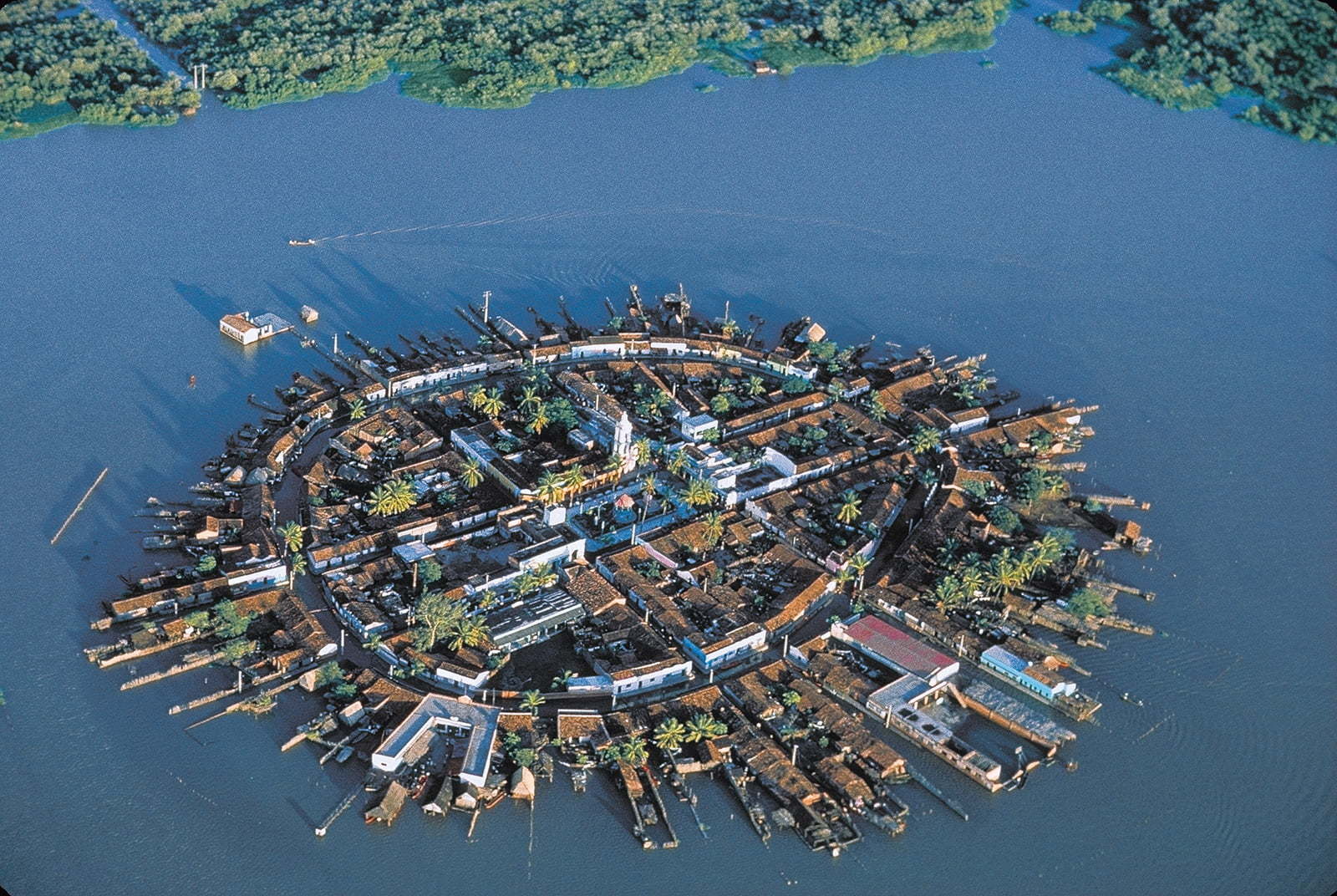 Village of Mexcaltitlán seems to float on the Rio San Pedro delta (between Mazatlan and San Blas). This photo, which is in our book Home Work, was shot in late summer 1968, when torrential rains turned streets into canals. At lower right is a partially submerged basketball court; U-shaped building at lower left is fisherman’s cooperative.