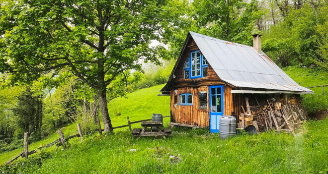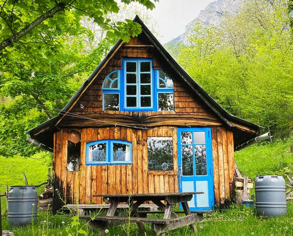 Our French friend and carpenter Yogan and his creations have appeared in a number of our books. He was hiking in the Pyrenees recently and came across this beautiful little home. He recognized it from Home Work, where it was featured in a section on countercultural builders in France, and shot this photo. It was built by Jeanne-Marie; she based the design on the old stone barns of the region, but used wood rather than stone. It’s one of my favorite little homes.