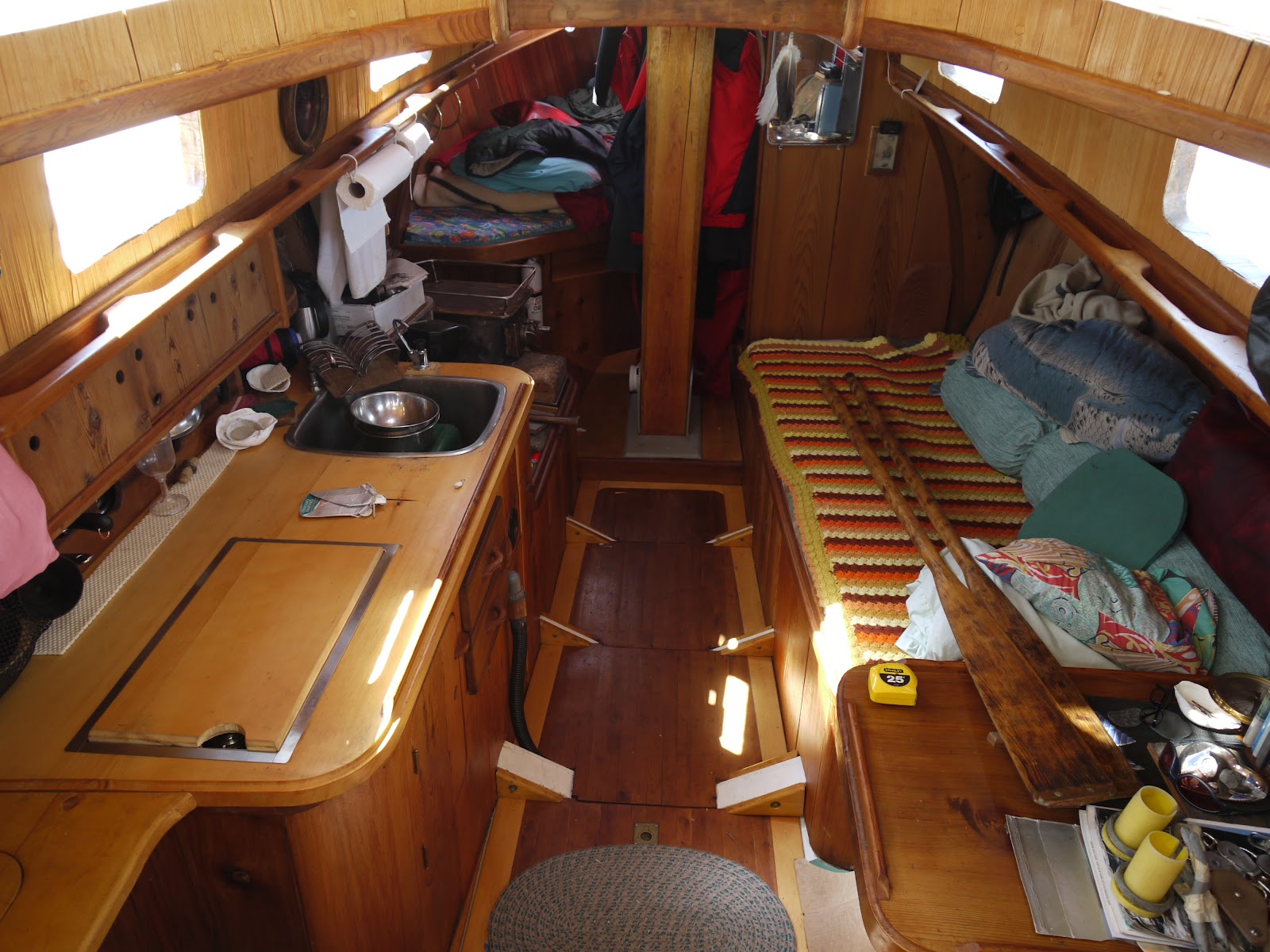 In between various small house projects I finally got this rebuild of a 23ft catboat finished and back in the water in time for a late summer on the Salish Sea. She was one of Bill Garden’s favourite designs with a strong fibreglass hull which made the boat well worth restoring, a vintage 7hp hand-crank Volvo diesel, a cedar and fir double-berth cabin with a forward galley, a few choice bits of locust, nazareno and bronze, but more paint than varnish. A simple classic 3 ton cruiser for inside waters with a 10ft beam and a big centerboard, she can handle an insanely huge gaff sail that will get lashed on as soon as I’ve strung up some new lazyjacks.