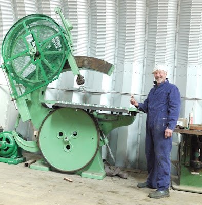 Godfrey’s friend Cos is getting ready to build a wooden 58′ cruising ketch, based on plans from 1926. The hull will be Douglas Fir milled by Cos and joints will be caulked with oakum — old school. Above is a huge ship’s saw. The old table saw below has two blades, either of which can be cranked into position. It operate smoothly.