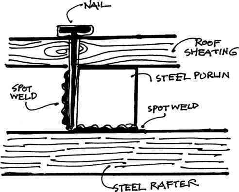 The wood sheathing is connected to the steel purlins by driving nails through the roof sheathing alongside the steel purlins, then welding to the purlins with wire-fed welder.