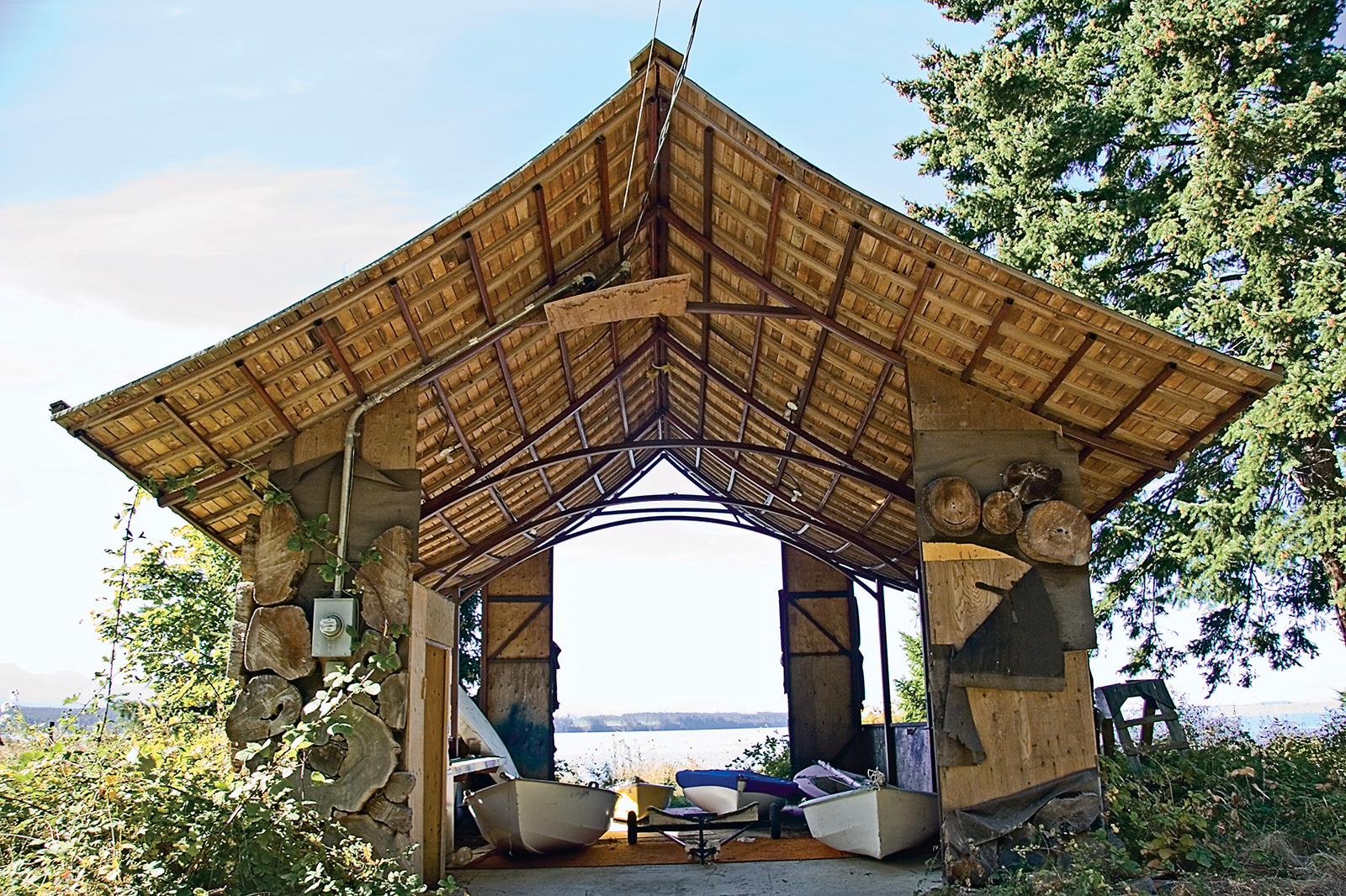 This gracefully curved little steel-frame boathouse was built by Dean Ellis on the beach of an island in the Strait of Georgia, BC. Posts are 4″–5″ steel, 8 feet on center. The curved steel purlins are 2½″ steel tubes, The curves formed on a break in a sheet metal shop. The 1″ by 6″ wood sheathing is welded to the steel purlins with nails.