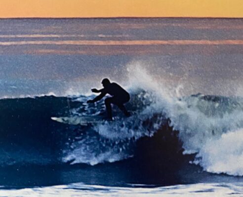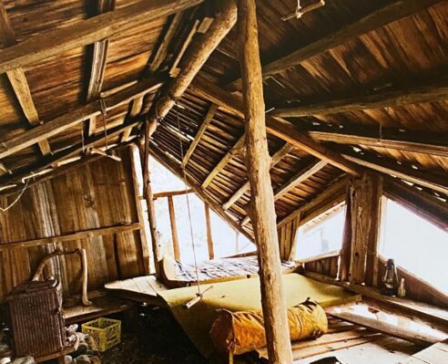 Surfer’s shack built by Bruno Atkey on the “Wild Coast,” about 40 miles by north of Tofino (reachable only by sea–no roads), on the west side of Vancouver Island. We went in Bruno’s 17-foot aluminum fishing boat, with 50 HP rope-pull-starter outboard motor), stayed there a couple of nights, fished, surfed, drank whiskey, and took a driftwood-fired sauna when I was shooting photos for Builders of the Pacific Coast. Bruno was one of the first surfers on Vancouver Island.