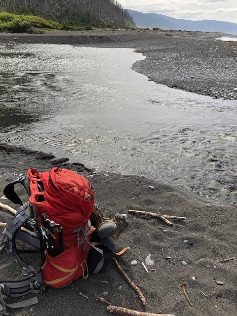 To begin with, it was harder going than I thought. My pack was really heavy. There was a rock slide upon entering the first part of the northern no-fly high tide zone that had to be clambered over. I hadn’t brought rain gear, either for me or the backpack, because the weather report had said no rain…well, 20% chance of rain the first day…and it started raining. Shit, if it poured I’d be screwed.