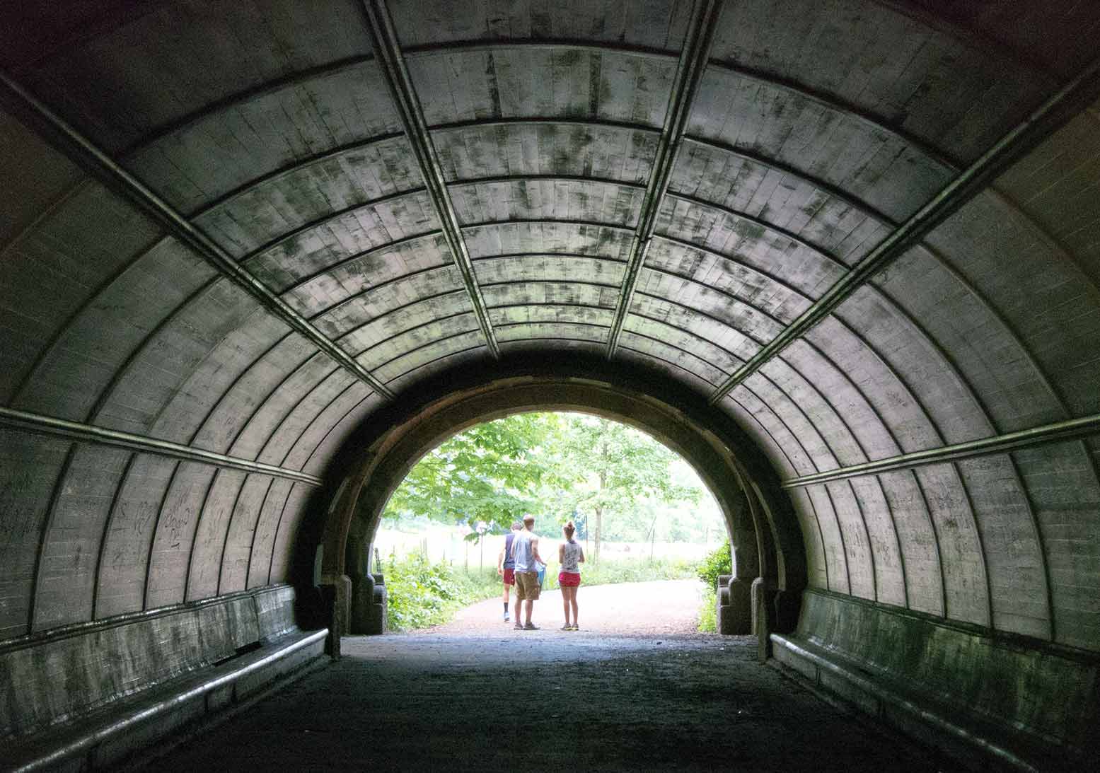 Wood-lined tunnel leading into the Grand Meadow in the 585-acre Prospect Park, Brooklyn, which was designed in 1865 by Frederick Law Olmsted & Calvert Vaux, and built in 1866-1873. The tunnel makes for a dramatic introduction to the beauty of the park.