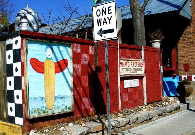 “This artistic and colorful fence is in the arts district in Silver City, New Mexico. Part of the fence appears to be from an old stamped metal ceiling.…”