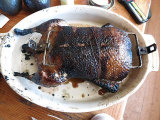 –Flaming Duck We’ve had a domestic (humanely raised, yada yada) duck in the freezer for a while. I come from a duck-hunting family and during the season we had wild duck every week. I’ve cooked plenty of wild ducks (500 degrees — let me know if you want my Mom’s recipe for roast duck), but never a domestic one. I set it up on the rotisserie rod on the Weber Genesis outdoor grill (which we use for everything of the meat persuasion), with a pan underneath to catch the fat. Things were going well, duck turning, fat dripping and I turned the grill up a bit, went out to the studio to do something, forgot the grill; when I got back, it was — shit! — smoking madly. Opened the cover and flames about 2 feet high were shooting up out of pan. Well, I’ll tell you, don’t throw water on a grease fire. Poom! Baking soda (a cooler head than mine prevailing) finally did the trick (in the pan after duck was removed). It put the fire out but ruined my plans for the duck fat. Duck fat donuts? Well, for sure, French fries. The duck turned out flavorful, like jerk chicken, the flames enhanced the flavor. The great chef.