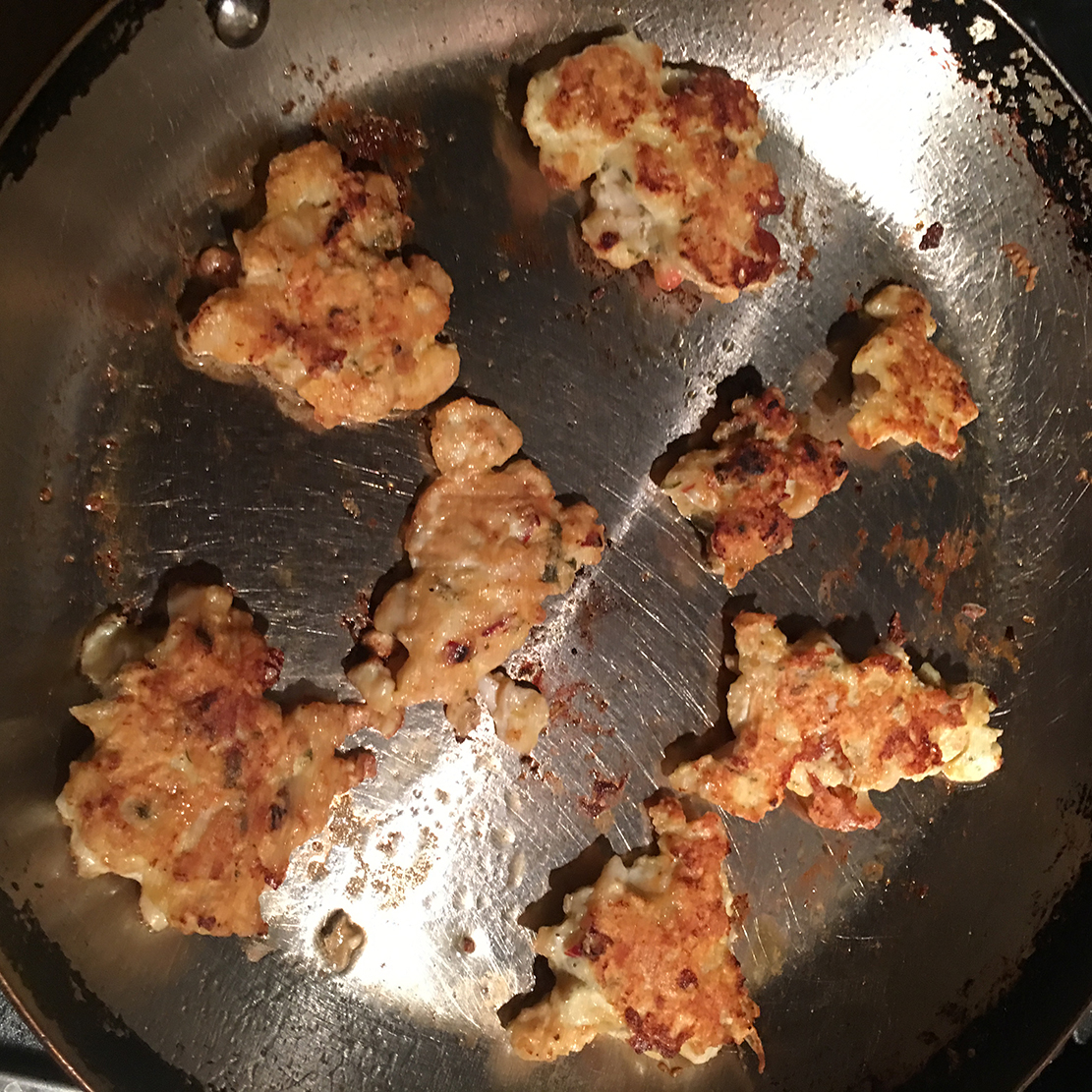Full disclosure: I’ve been to one of Kirk’s fishing demos, attended a seminar on making pickled herring, and went fishing with him for night smelt (caught 15 lbs. that night, netting them in the surf).) I’ve gotten a ton of useful info from him, including tonight, when I used his technique for getting the skin off horseneck clam siphons (slit lengthwise, soak in warm water for 10 min.) before making clam fritters (below, left).