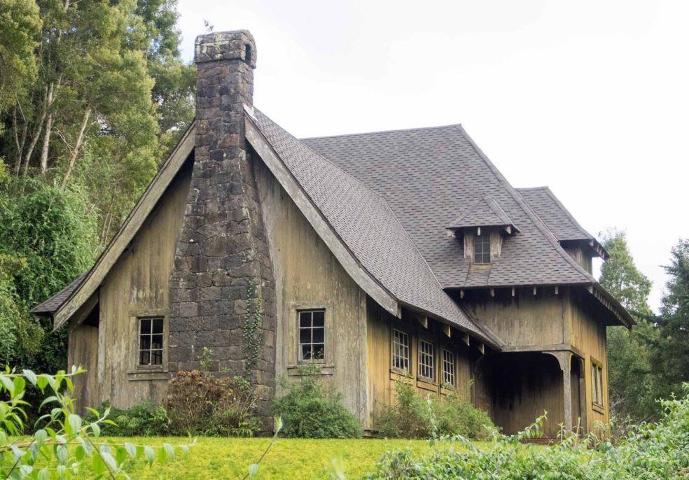 This reminds me of homes designed by Bernard Maybeck and Julia Morgan during the Arts and Crafts Movement in the San Francisco Bay Area in the early 1900s. Note the fine lava rock masonry work of the fireplace, the gentle curves at the ends of the rafters. Well designed, well built.