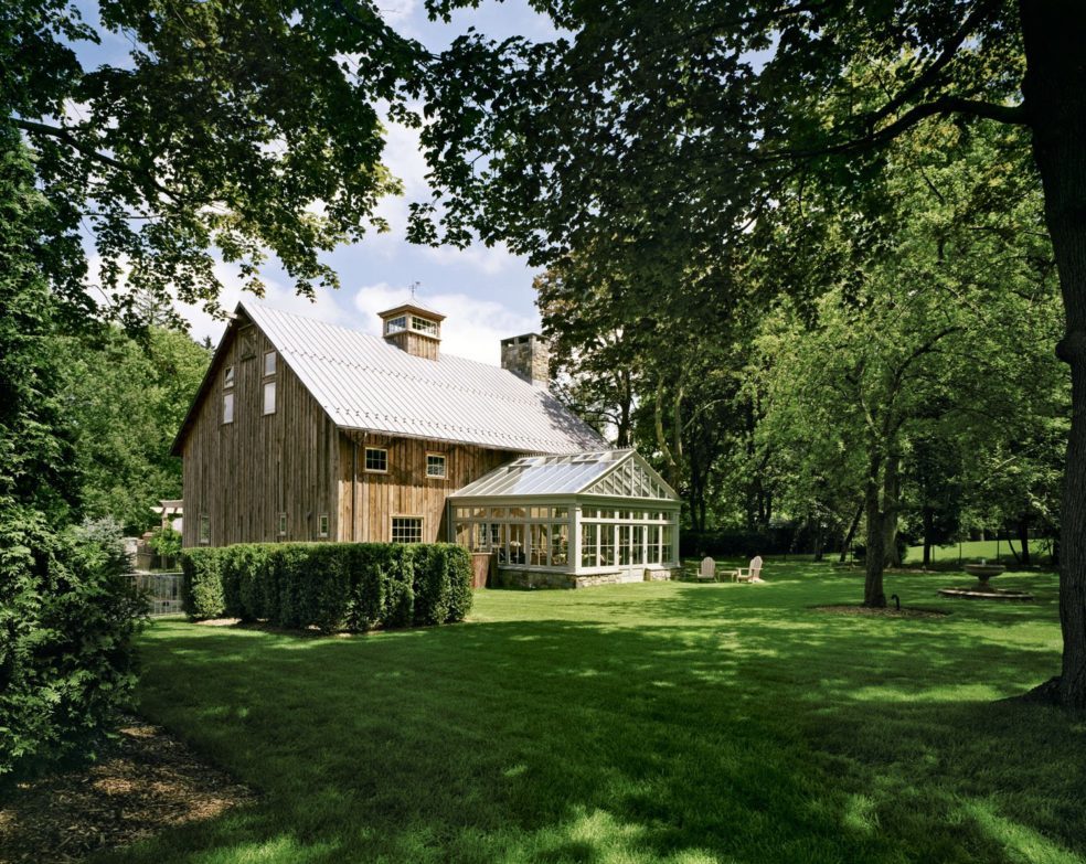 “This huge, sawn-timber hay barn was originally built circa 1870. The flooring, ceiling and exterior siding are vintage reclaimed barn boards. The restored barn is now a guest house, garage and wine cellar for a residential estate in southwestern Connecticut.”