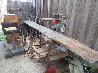 This Delta radial arm saw must be 50 years old. Bought it used in the ’70s. Has worked flawlessly ever since. American made. At left is a Back Revolution machine, sold by Stretching Inc. Use to invert and stretch spine. You hang upside down by yr. hips.