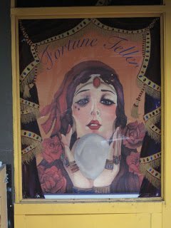 I’m writing this from a cool little cafe, with barista latte and free wi-fi, the Cafe Bean, 800 Sutter, checking my mail, getting ready to go over to the Green Festival. This fortune teller painting is just down the block.