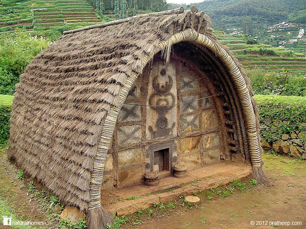 To give a grand look to the facade a cylindrical bunch of hay is attached. The interior is windowless and dark consisting of a single space. A raised earthen platform takes up much of one side for sitting and sleeping. A fire is kept farthest from the small door, typically 2ft 6″ (75cm) high. The fire, which smokes continuously, is key to protection from the weather and termites. You can see more pictures and read here about Toda architecture.”