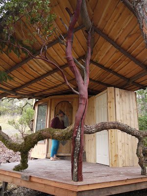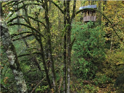 `jonaven moore says this about the photo:”…photo of the treehosue that I got by hanging from a rope, walking out on a branch 30 ft up an adjacent spruce tree. I only just this fall got connected to the power grid, so i built everything there off grid, and the powerstation in the caboose sustained a lot of it.”`