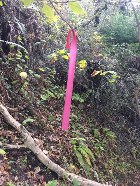 BUT then I spotted some red banners. and started following them down to the bottom of the canyon, and there was a faint trail going up the steep west side. Never been so glad to see trail markers.