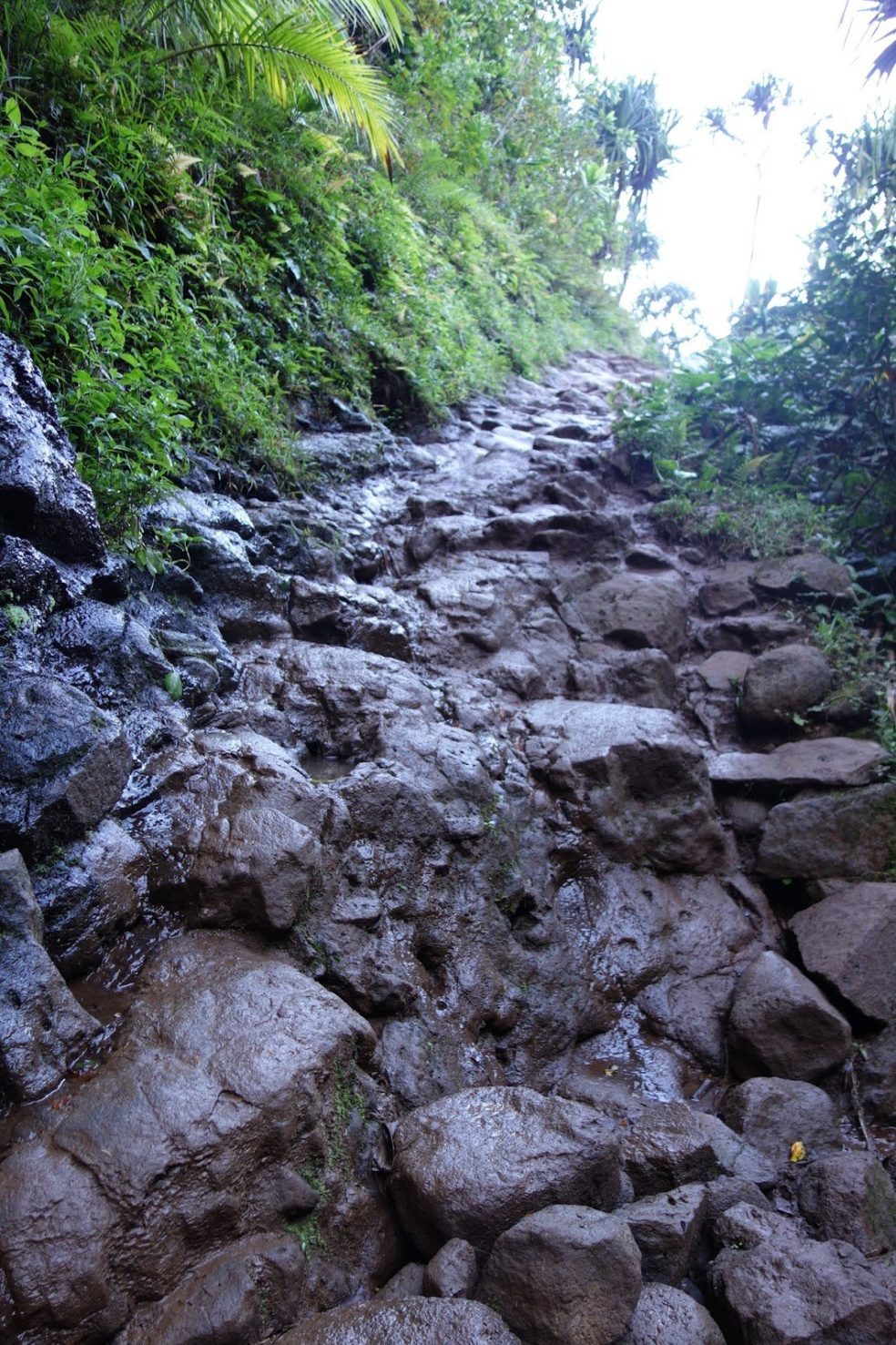 This is a steep, rugged section of land at the end of the road on the north shore of Kauai. I hiked in 2 miles to Hanakapiai Beach and it was tough! This is a mother of a trail, steep and slippery in parts. When I got to the beach, the surf was (sorry to use the word) awesome. 15’+ shore break. Anyone in the water would be more or less instantly killed, if not by the bonecruncher waves, by the rocky (no sand this time of year) shore.
