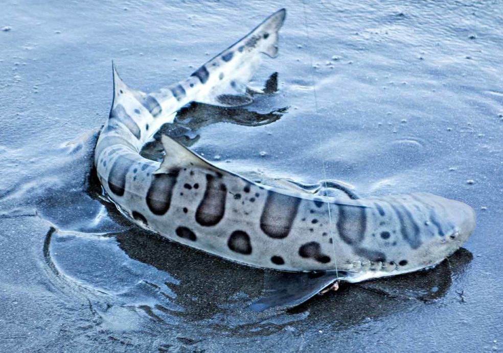 A fisherman caught this little (3′-4′) leopard shark. It had never occurred to me how beautiful they are. I mentioned this to a surfer friend who was there and he said, Yeah that’s true. It had been hooked in a fin. The fisherman got the hook out and it took off out into the sea. There’s just so much going on in the world every day!