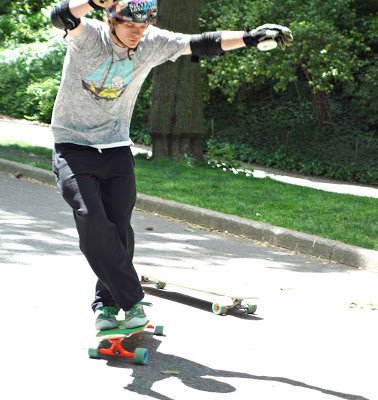 Since I’ve never learned to slide (whereby you can control yr. speed), I need to get off the board before getting to the speed where I can’t get off and remain vertical. For now I’m just skating gentle slopes and carving. No (well not much) bombing.