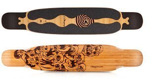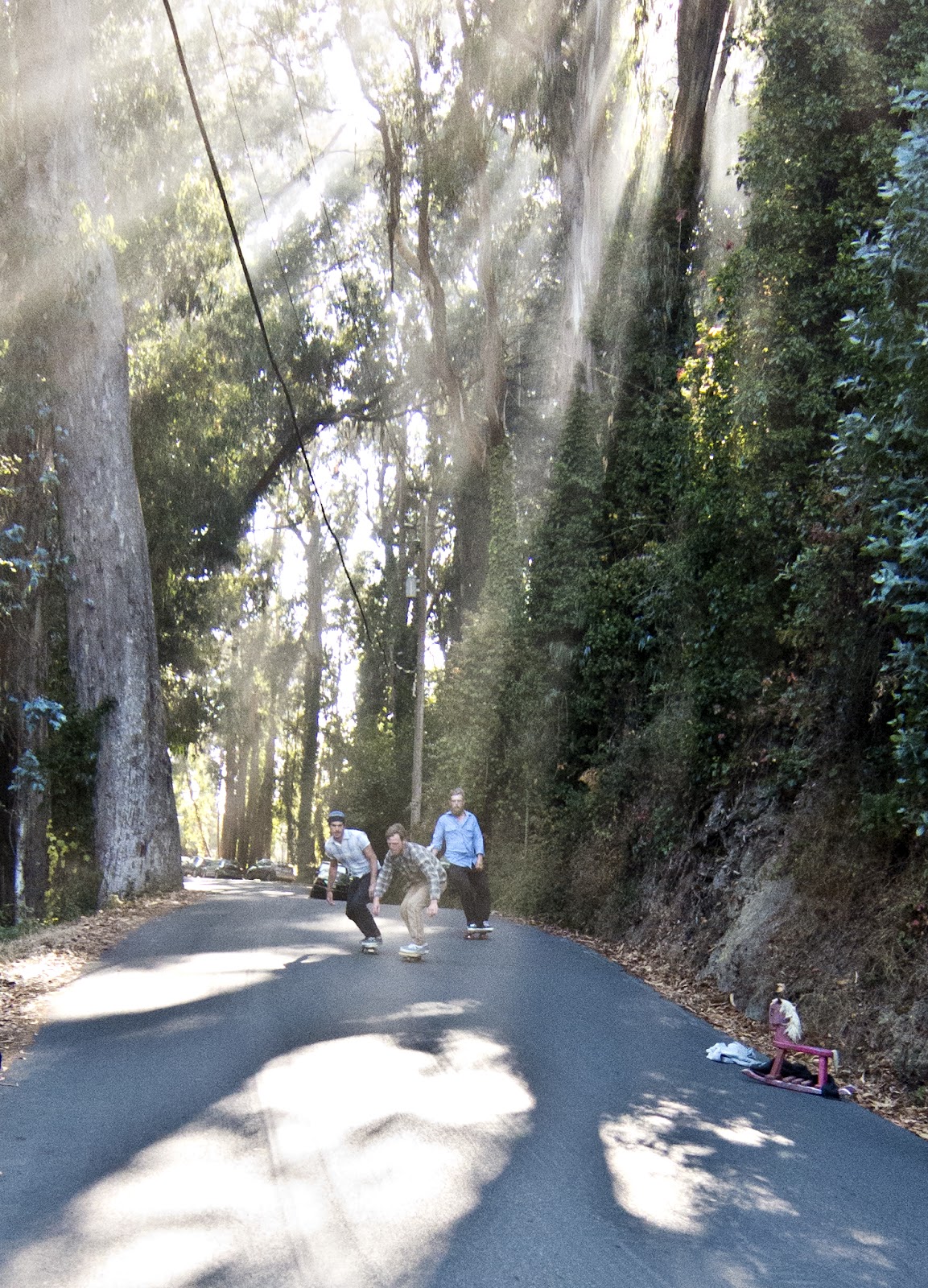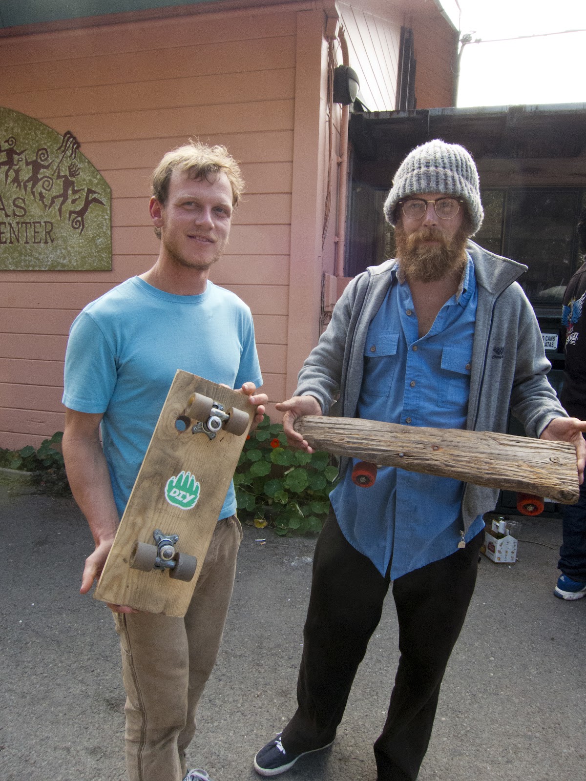 Spotted this great driftwood skateboard today. Here is, l-r, Sean Hellfritsch, Ryan Hett (driftwood board). Later I shot pic of them skating down pretty steep hill with their buddy Nick Alves on a carved-up snowboard. Witty.