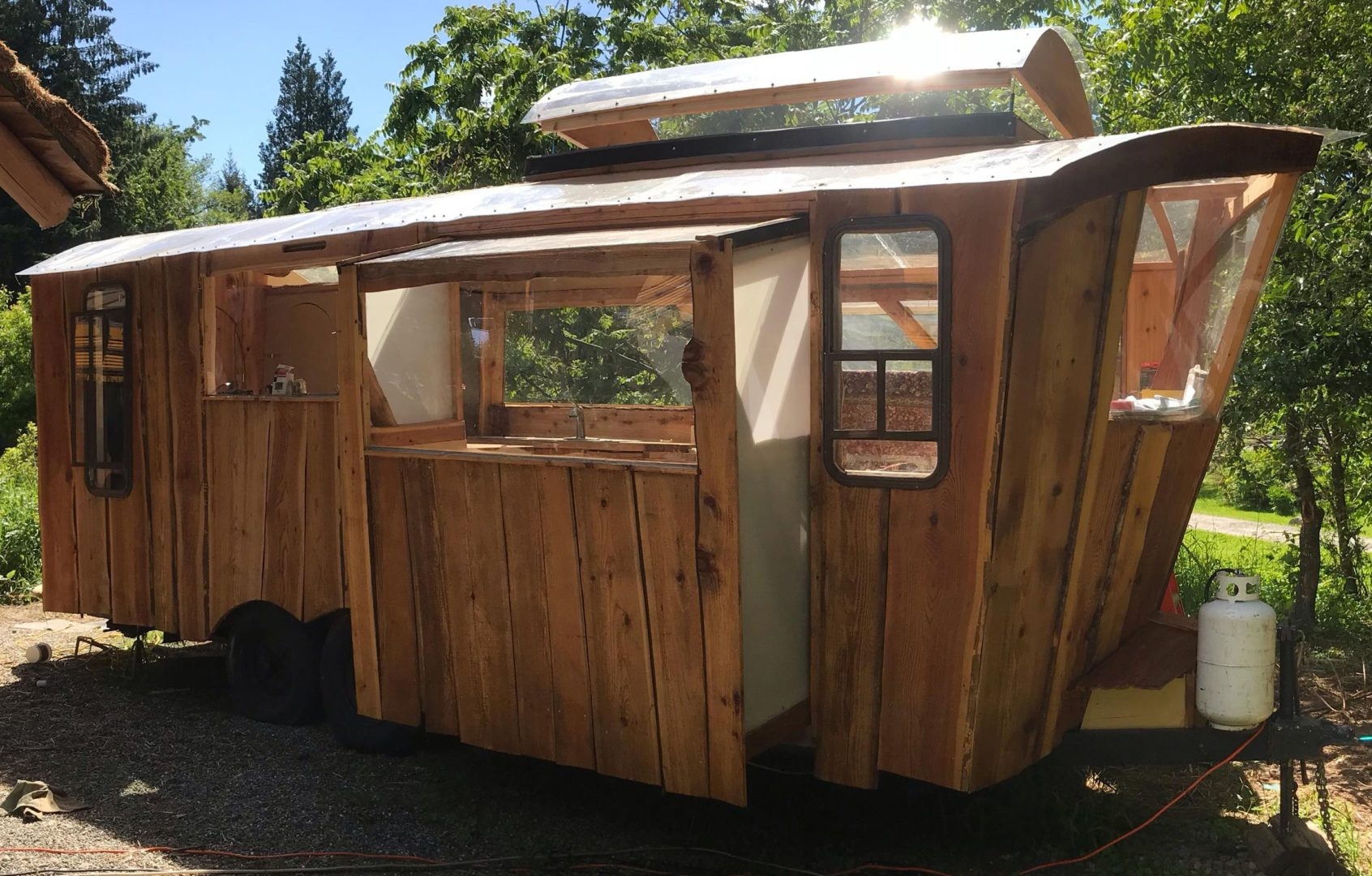 Yogan, a highly creative French carpenter, has been in our last three books. Here is his latest creation, about which he wrote:This is a 2002 Mercedes 311cdi Sprinter double-cabin (7 seats) truck with a hydraulic bed lift. I call it Le Benne-Benz. I wanted the 7-seater because we live in collective and it’s cool to go to festivals in only one vehicle! All the stuff (tent, mattress, etc.) is in the truck and there’s only one driver! It’s also good for a hot tub and a good stage for a concert!