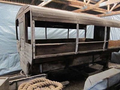 The horse contraption holds a horse immobile while it is beings shoed. That’s a wooden (horse-drawn) school bus.