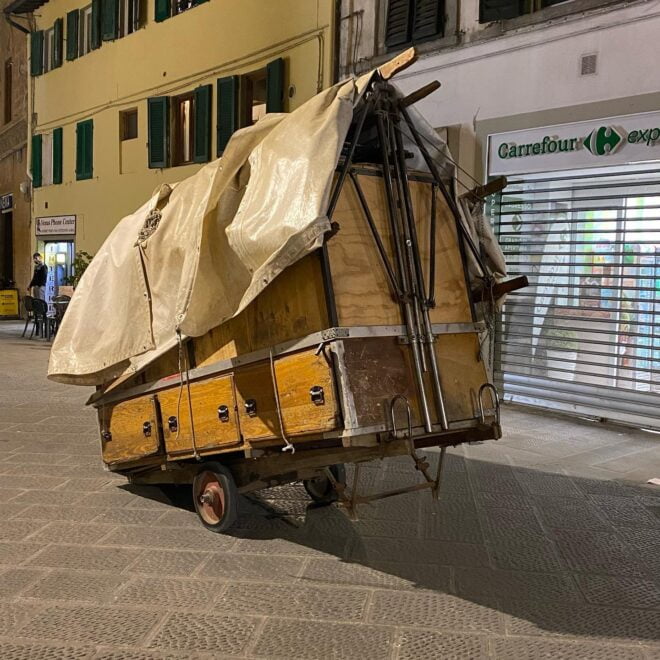 Each night, the street vendors pack up their stalls and wheel them to storage yards until the next day.